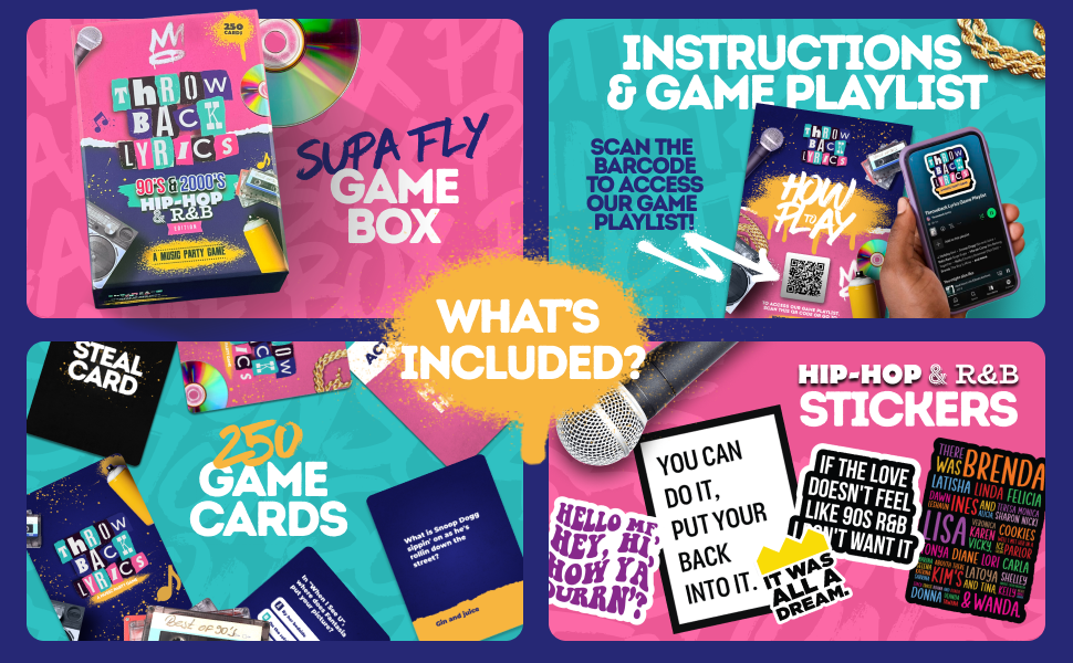 - 🎶 Game Playlist: Scan the barcode on the instructions to access our Throwback Lyrics game playlist and sing and dance to all the throwback hits included in the game while you play!